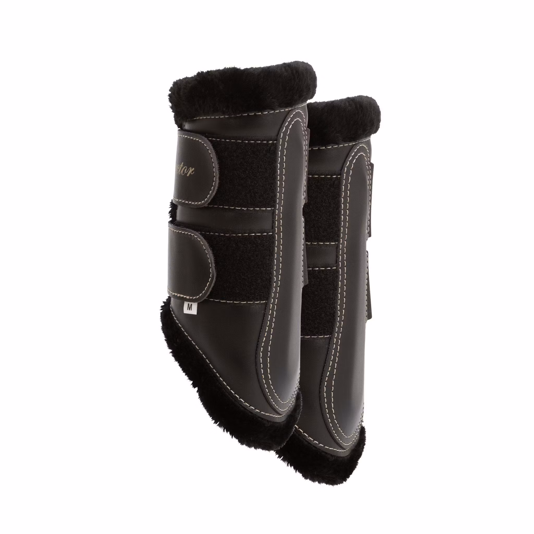 Benskydd i konstläder med insida av artificiell päls, kraftig elastisk kardborreknäppning. Passar både fram- och bakben. Maskintvättas i 40 grader. 2-pack.