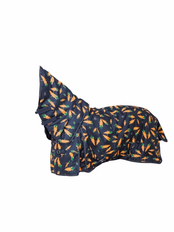 Förtjusande regntäcke med morotsmönster och 150 g fyllning. Täcket har en avtagbar halsdel med kardborrefäste. Yttertyget är vattentätt (3 000 mm) 600D ripstop, och täcket har dessutom tejpade sömmar. För ökad komfort och rörelsefrihet finns höga bogveck, elastiska kryssgjordar samt elastiska benremmar.